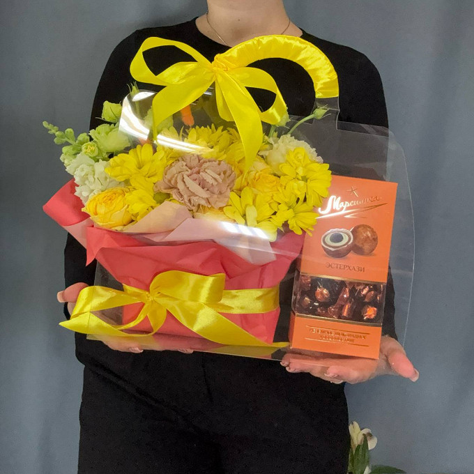 Антирринум (львиный зев), Лагурус, Лента, Пиафлор / оазис/ флор. губка, Пленка, Эустома (Лизиантус), коробка конфет, роза кустовая пионовидная, хризантема кустовая, переноска-сумка