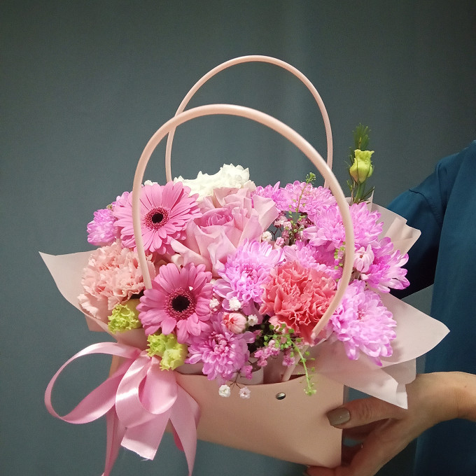 Гербера мини, Диантус, Коробка Трапеция, Лента, Пиафлор / оазис/ флор. губка, Пленка, Роза Французская Эквадор, Хамелациум (Шамелациум), Хризантема кустовая Балтика, Эустома (Лизиантус)