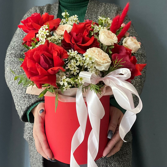 Коробка, Лагурус, Лента, Пиафлор / оазис/ флор. губка, Пленка, Роза кустовая, Хамелациум (Шамелациум), роза французская